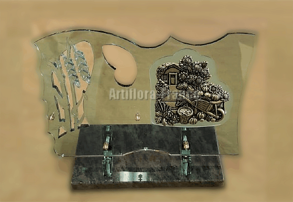 PLAQUE ALTUGLASS VERT 20X30CMSUR SOCLE EN GRANIT VERTDECOUPE EPIS DE BLE+ BRONZE BROUETTE POTAGER