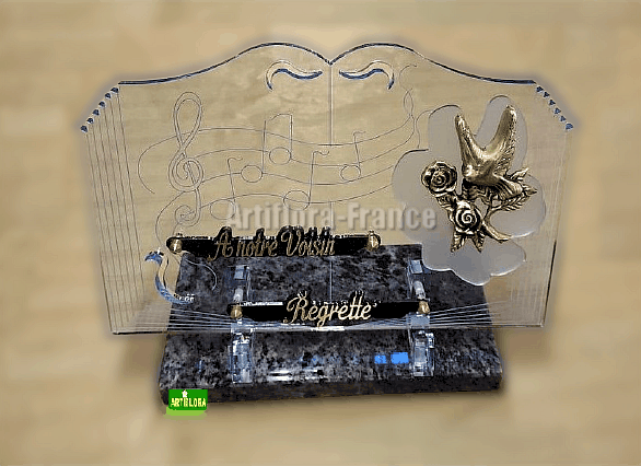 PLAQUE ALTUGLASS BLEU 20X30CMSUR SOCLE EN GRANIT MAS BLUEDECOUPE LIVRE PORTEE DE NOTES MUSIQUE+ BRONZE OISEAU ROSES